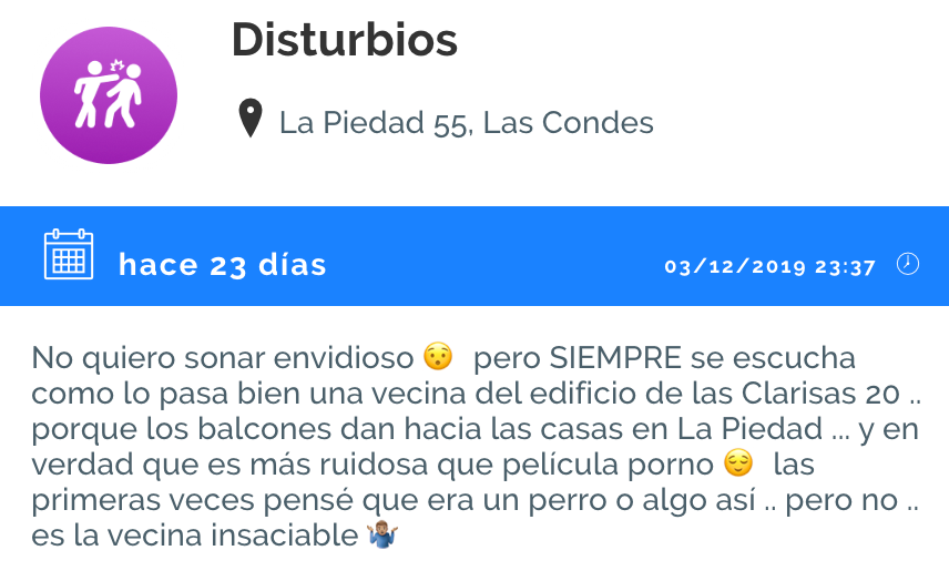 Los reportes los lanzamos en Mayo del 2017 y recientemente, el 01 de Diciembre de 2019, se creó el reporte número 1.000.000 🎉. ¿De qué se trataba el reporte número 1.000.000? De "Ruidos molestos" en su vecindario (esperamos que los vecinos hayan celebrado bien y luego bajado el volumen del carrete para que los demás pudieran descansar).